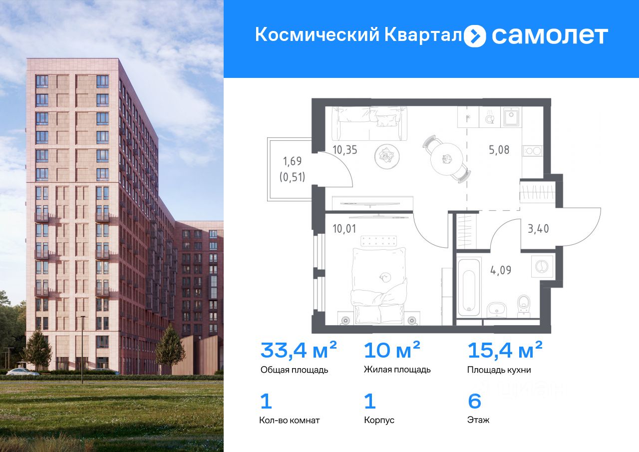 Предлагается 1-комнатная квартира комфорт-класса 33,44 кв.м в корпусе 1 на 6 этаже, в ЖК ''Космический Квартал'' Квартира с чистовой отделкой. Доступность дополнительных опций уточняйте у застройщика. Приобрести квартиру возможно по специальным акциям от застройщика, с текущими условиями акций можно ознакомиться в блоке ''Акций''. Цена динамическая и может отличаться, уточняйте актуальность у застройщика. ''Космический Квартал'' находится в Московской области, в Королеве. В Королеве находятся несколько парков и лесов, а реки Клязьма и Яуза окружают наукоград с двух сторон. Путь до Москвы будет быстрым и удобным: до МКАД — 20 минут на автомобиле, а до ж/д станция Болшево - 8 минут на авто или 20 минут пешком. В проекте предусмотрены собственный детский сад, многоуровневые паркинги, а также магазины, спортзал, ресторан и аптеки на первых этажах домов. Неподалеку от квартала находятся городские гимназии 3 и ''Ковчег'' и лицей 4. ''Космический Квартал'' — это 3 монолитных дома высотой 12-17 этажей. Во внутреннем приватном дворе-парке будут детские и спортивные площадки. А для занятий спортом будут обустроены воркаут-пространства. Все подъезды — с безбарьерным входом. В лобби есть помещения для велосипедов и колясок. На техническом этаже — индивидуальные кладовые для сезонных вещей. Продуманные планировки от небольших студий до просторных 4-комнатных квартир с гардеробной, постирочной и гостевым санузлом. Квартиры сдаются как с отделкой, так и без нее.