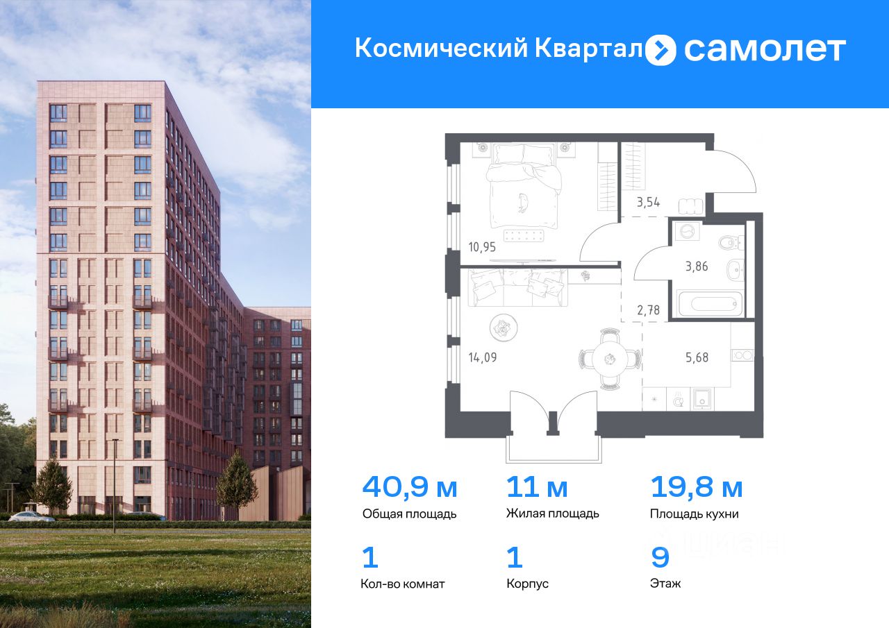 Предлагается 1-комнатная квартира комфорт-класса 40,9 кв.м в корпусе 1 на 9 этаже, в ЖК ''Космический Квартал'' Квартира с чистовой отделкой. Доступность дополнительных опций уточняйте у застройщика. Приобрести квартиру возможно по специальным акциям от застройщика, с текущими условиями акций можно ознакомиться в блоке ''Акций''. Цена динамическая и может отличаться, уточняйте актуальность у застройщика. ''Космический Квартал'' находится в Московской области, в Королеве. В Королеве находятся несколько парков и лесов, а реки Клязьма и Яуза окружают наукоград с двух сторон. Путь до Москвы будет быстрым и удобным: до МКАД — 20 минут на автомобиле, а до ж/д станция Болшево - 8 минут на авто или 20 минут пешком. В проекте предусмотрены собственный детский сад, многоуровневые паркинги, а также магазины, спортзал, ресторан и аптеки на первых этажах домов. Неподалеку от квартала находятся городские гимназии 3 и ''Ковчег'' и лицей 4. ''Космический Квартал'' — это 3 монолитных дома высотой 12-17 этажей. Во внутреннем приватном дворе-парке будут детские и спортивные площадки. А для занятий спортом будут обустроены воркаут-пространства. Все подъезды — с безбарьерным входом. В лобби есть помещения для велосипедов и колясок. На техническом этаже — индивидуальные кладовые для сезонных вещей. Продуманные планировки от небольших студий до просторных 4-комнатных квартир с гардеробной, постирочной и гостевым санузлом. Квартиры сдаются как с отделкой, так и без нее.