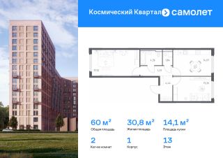 Предлагается 2-комнатная квартира комфорт-класса 57,47 кв.м в корпусе 1 на 11 этаже, в ЖК ''Космический Квартал''Квартира с чистовой отделкой. Доступность дополнительных опций уточняйте у застройщика.Планировкой предусмотрены:Прихожая - 4,68 м²Коридор - 4,3 м²Кухня - 14,01 м²Жилая_комната_1 - 15,6 м²Жилая_комната_2 - 13,2 м²СУ_1 - 2,79 м²СУ_2 - 2,89 м²Приобрести квартиру возможно по специальным акциям от застройщика, с текущими условиями акций можно ознакомиться в блоке Акций.Цена динамическая и может отличаться, уточняйте актуальность у застройщика.''Космический Квартал'' находится в Московской области, в Королеве. В Королеве находятся несколько парков и лесов, а реки Клязьма и Яуза окружают наукоград с двух сторон. Путь до Москвы будет быстрым и удобным: до МКАД — 20 минут на автомобиле, а до ж/д станция Болшево - 8 минут на авто или 20 минут пешком.В проекте предусмотрены собственный детский сад, многоуровневые паркинги, а также магазины, спортзал, ресторан и аптеки на первых этажах домов. Неподалеку от квартала находятся городские гимназии 3 и ''Ковчег'' и лицей 4. ''Космический Квартал'' — это 3 монолитных дома высотой 12-17 этажей. Во внутреннем приватном дворе-парке будут детские и спортивные площадки. А для занятий спортом будут обустроены воркаут-пространства. Все подъезды — с безбарьерным входом. В лобби есть помещения для велосипедов и колясок. На техническом этаже — индивидуальные кладовые для сезонных вещей. Продуманные планировки от небольших студий до просторных 4-комнатных квартир с гардеробной, постирочной и гостевым санузлом. Квартиры сдаются как с отделкой, так и без нее.