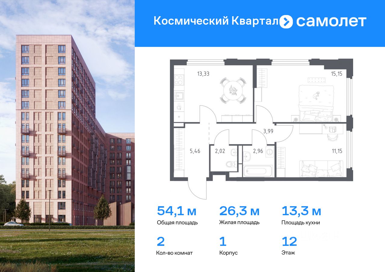 Предлагается 2-комнатная квартира комфорт-класса 54,06 кв.м в корпусе 1 на 12 этаже, в ЖК ''Космический Квартал'' Квартира без отделки. Доступность опции ''отделка'' и возможность комплектации мебелью и декором уточняйте у застройщика.