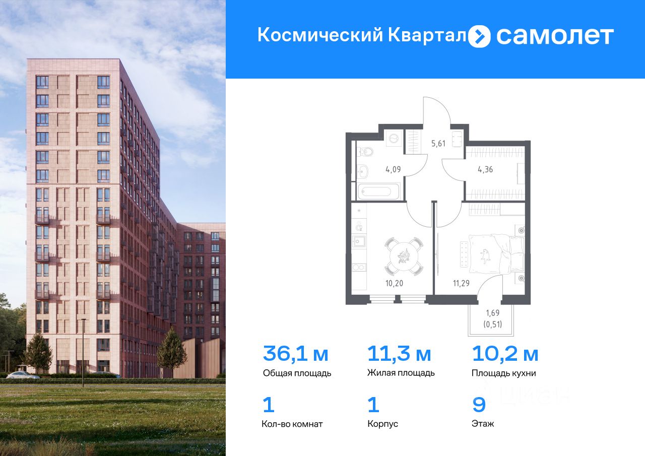 Предлагается 1-комнатная квартира комфорт-класса 36,06 кв.м в корпусе 1 на 9 этаже, в ЖК ''Космический Квартал'' Квартира без отделки. Доступность опции ''отделка'' и возможность комплектации мебелью и декором уточняйте у застройщика.