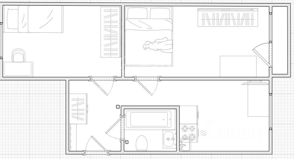 При 42,4 метров общей площади, 31,3 метров из них - жилая площадь. Две изолированные комнаты, окна выходят на 2 стороны дома (распашонка). Застекленный балкон!