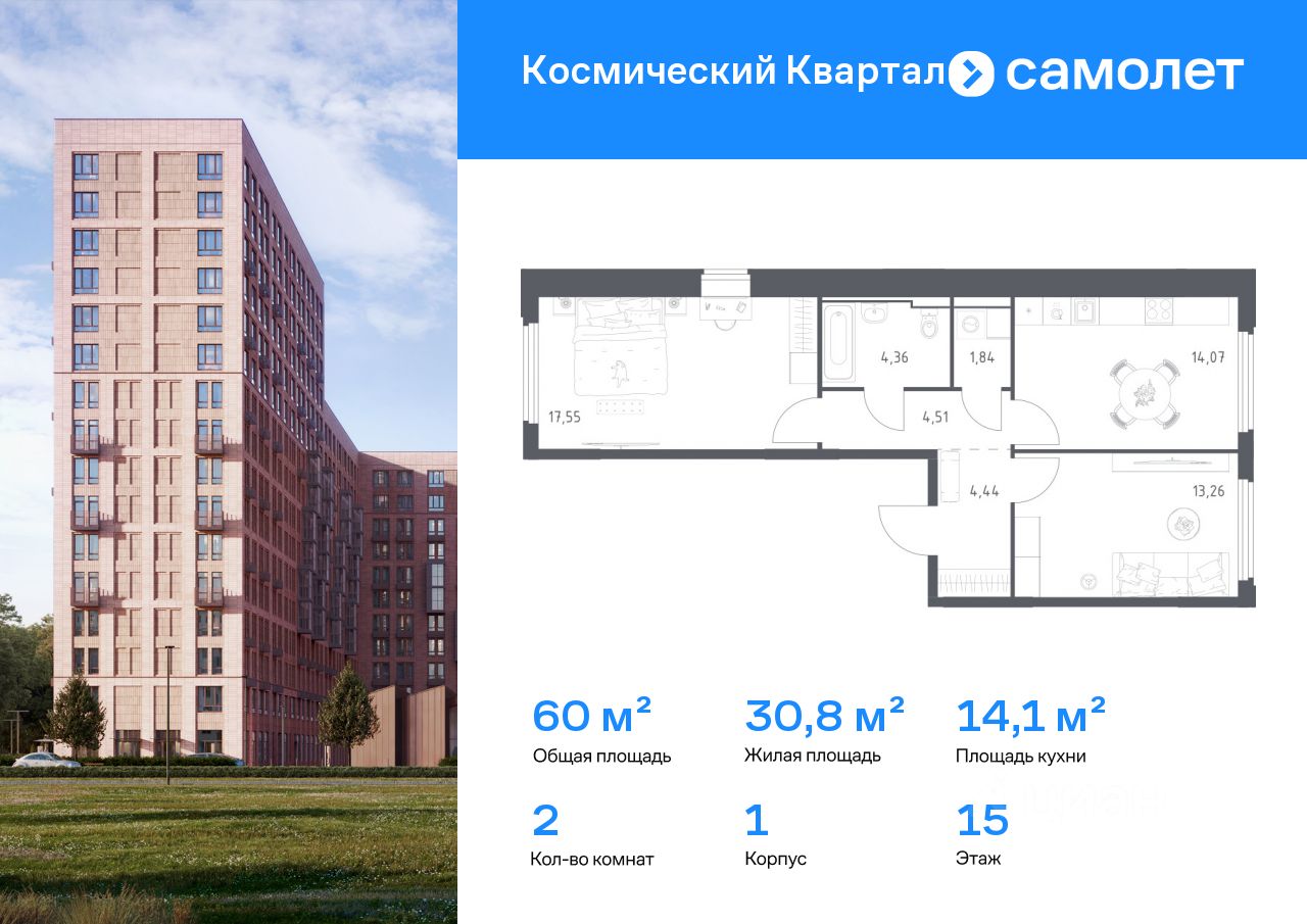Предлагается 2-комнатная квартира комфорт-класса 60,03 кв.м в корпусе 1 на 15 этаже, в ЖК ''Космический Квартал'' Квартира с чистовой отделкой. Доступность дополнительных опций уточняйте у застройщика.