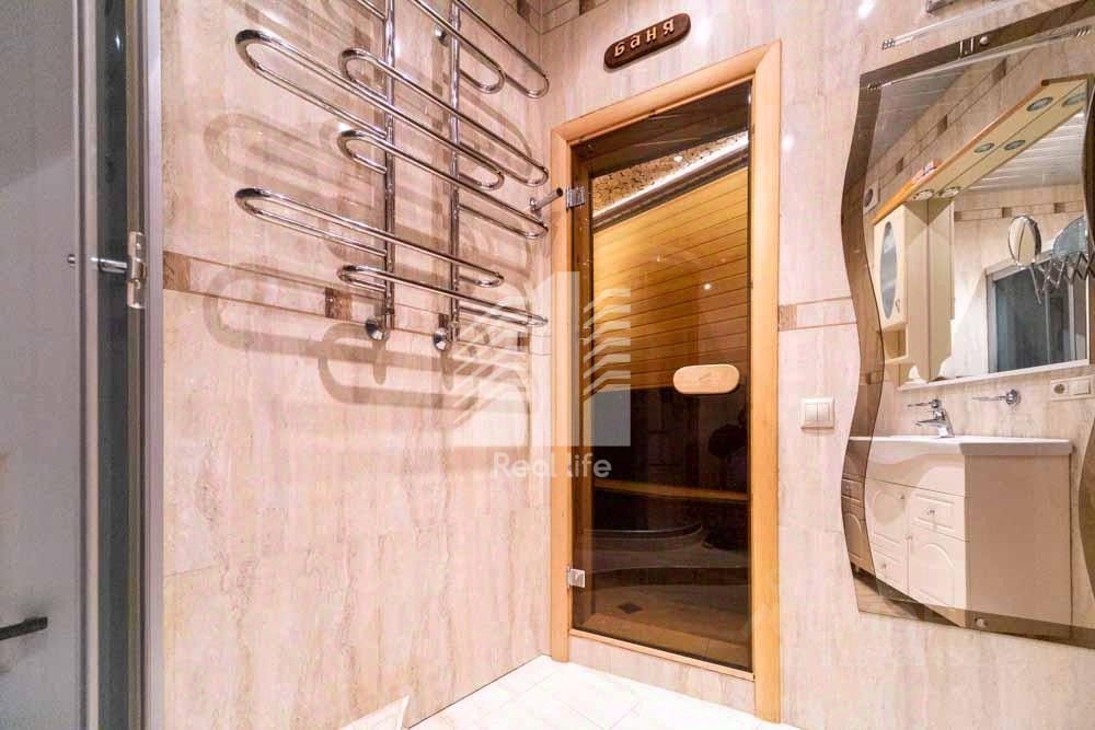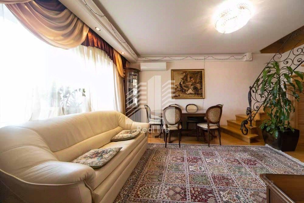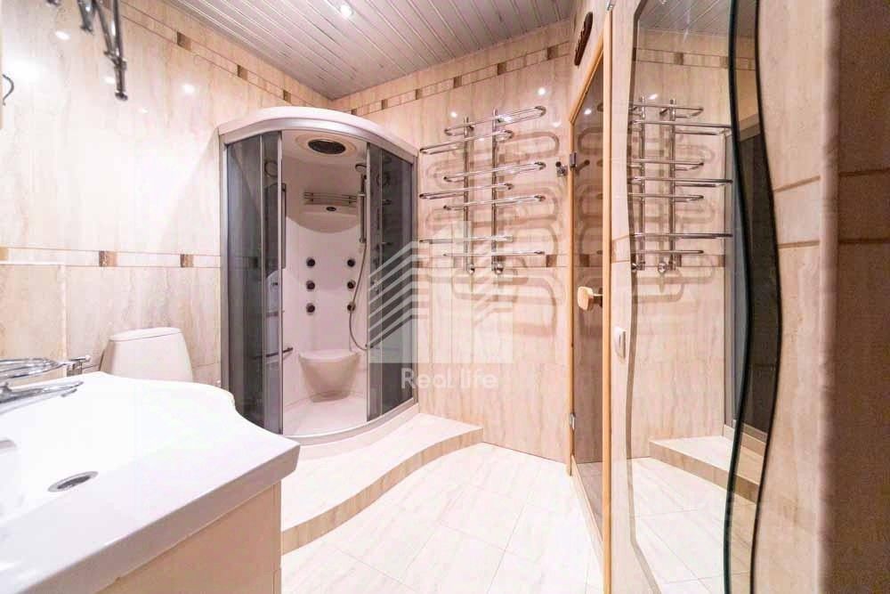 Общая площадь 90,8 квадратных метра, из которых 59,2 квадратных метра - жилая площадь. На первом уровне находится кухня 9 квадратных метра, комната 19,6 квадратных метра и совмещенный санузел с ванной, лоджия. На втором уровне три комнаты, две из них изолированные 13,1 и 12,9 квадратных метра и одна проходная 13,6 кв. метра, совмещенный санузел с душевой кабиной и сауна.