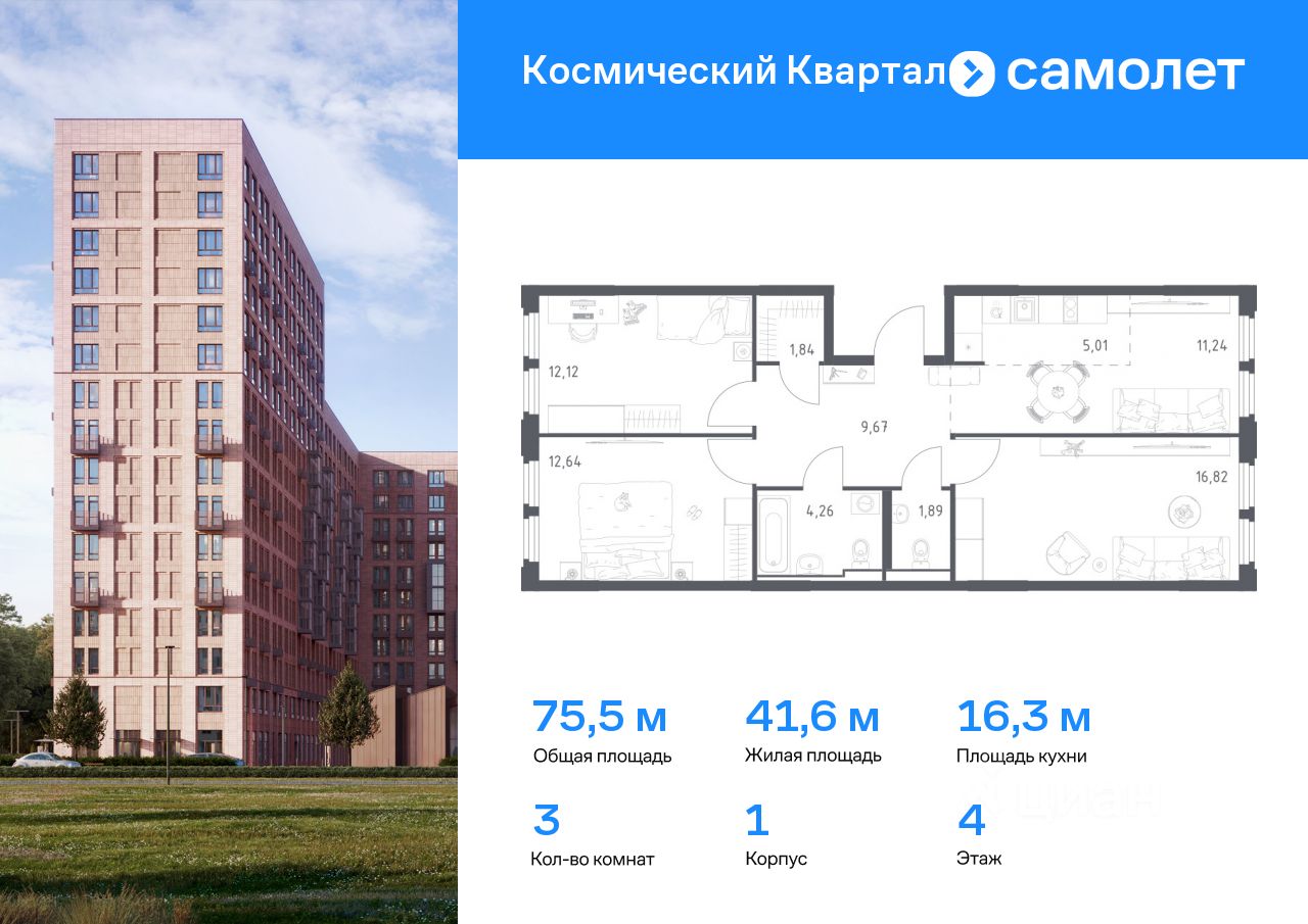 Предлагается 3-комнатная квартира комфорт-класса 75,49 кв.м в корпусе 1 на 4 этаже, в ЖК ''Космический Квартал'' Квартира без отделки. Доступность опции ''отделка'' и возможность комплектации мебелью и декором уточняйте у застройщика.