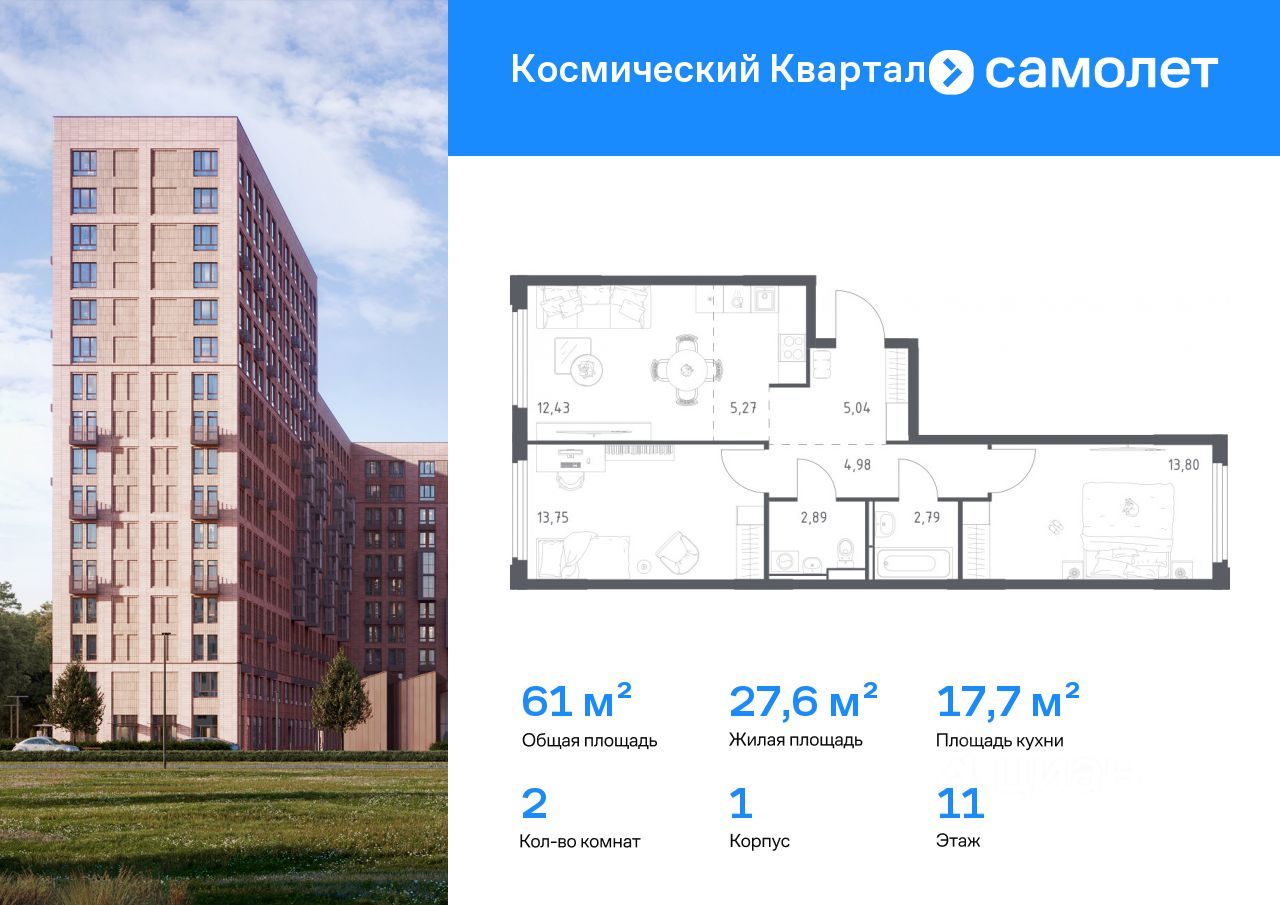 Предлагается 2-комнатная квартира комфорт-класса 60,95 кв.м в корпусе 1 на 11 этаже, в ЖК ''Космический Квартал'' Квартира без отделки. Доступность опции ''отделка'' и возможность комплектации мебелью и декором уточняйте у застройщика.