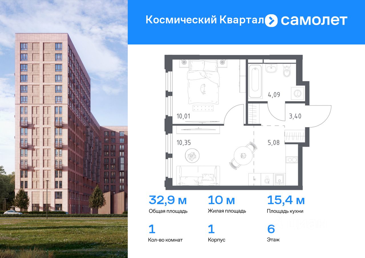 Предлагается 1-комнатная квартира комфорт-класса 32,93 кв.м в корпусе 1 на 6 этаже, в ЖК ''Космический Квартал'' Квартира с чистовой отделкой. Доступность дополнительных опций уточняйте у застройщика.
