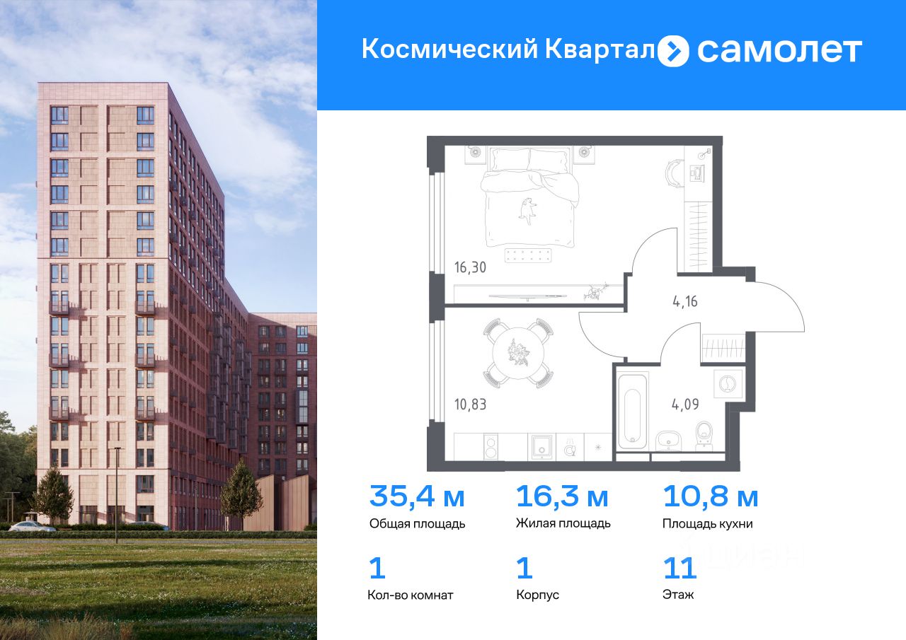Строим кварталы для жизни с заботой о будущем. Предлагается 1-комнатная квартира комфорт-класса 35,38 кв.м в корпусе 1 на 11 этаже, в ЖК ''Космический Квартал'' Квартира с чистовой отделкой. Доступность дополнительных опций уточняйте у застройщика.