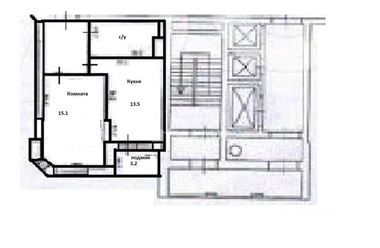 Общая площадь 45,1 метров. Светлая комната 15,1 метров, функциональная кухня-гостиная 13.5 метров с выходом на лоджию, совмещенный санузел.