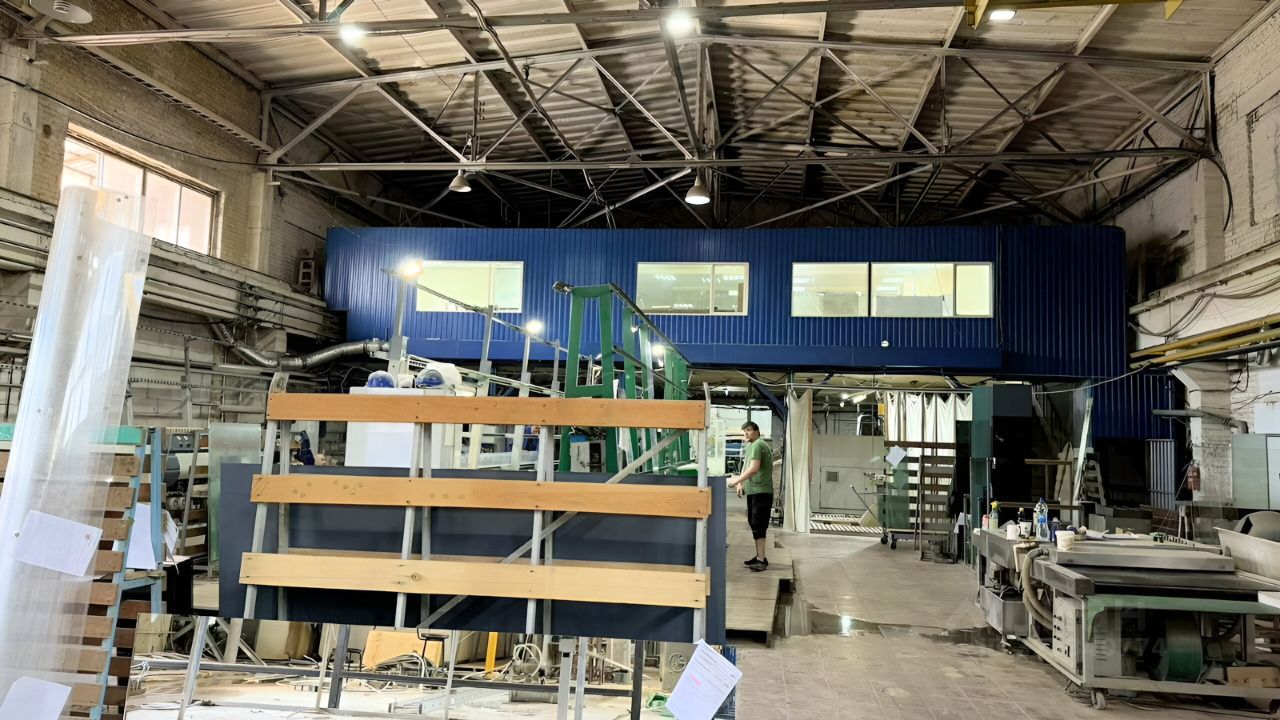 Площадь первого этажа производства 980м2, офисно-складской части на втором этаже 356м2 и 91 м2 раздевалка.