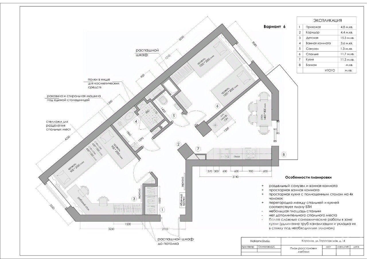 Комнаты 15,3 и 11,7 кв.м., кухня 11,3 кв.м. , прихожая 9,2 кв.м., ванная комната 3,6 кв.м. и туалет 1,3 кв.м.