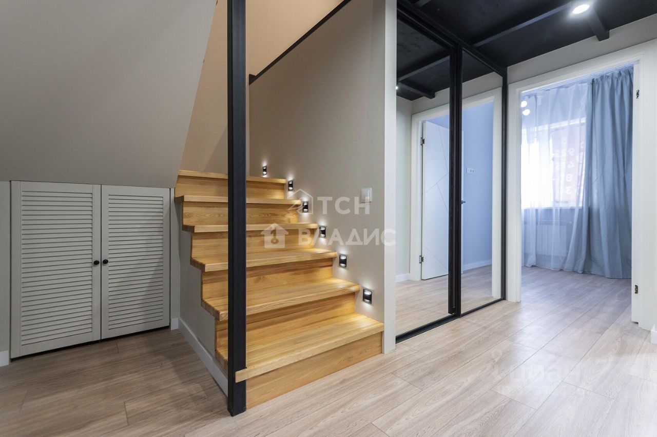Квартира укомплектована: - просторная гардеробная в коридоре, - в спальне на втором уровне кровать с матрасом, кондиционер, телевизор, - осветительные приборы, - встроенная кухня, варочная панель, духовой шкаф, вытяжка, кондиционер, обеденный стол, стулья, холодильник, - стиральная машина.