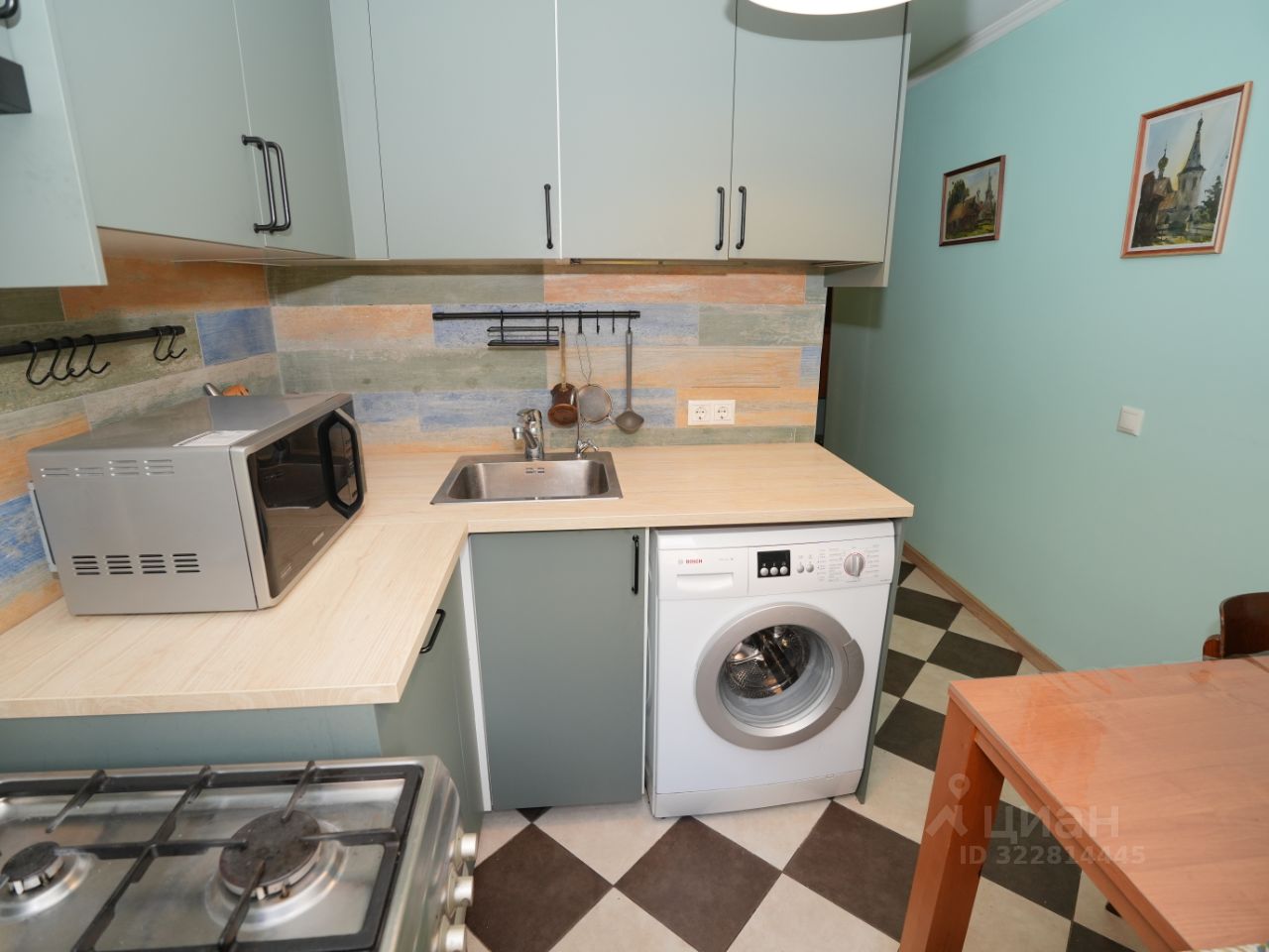 Кухня: Кухонный гарнитур, Газовая плита, холодильник, стол, стиральная машина