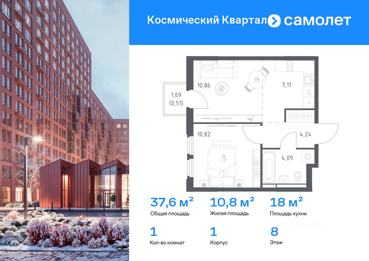 Строим кварталы для жизни с заботой о будущем. Предлагается 1-комнатная квартира комфорт-класса 37,63 кв.м в корпусе 1 на 8 этаже, в ЖК ''Космический Квартал'' Квартира с чистовой отделкой. Доступность дополнительных опций уточняйте у застройщика.