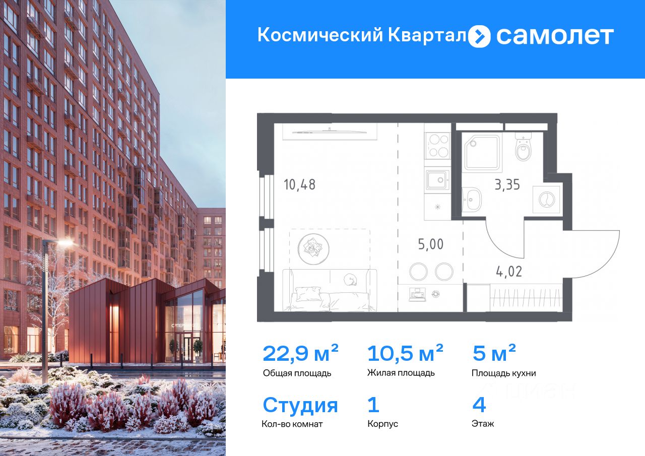 Строим кварталы для жизни с заботой о будущем. Предлагается квартира студия комфорт-класса 22,85 кв.м в корпусе 1 на 4 этаже, в ЖК ''Космический Квартал'' Квартира без отделки. Доступность опции ''отделка'' и возможность комплектации мебелью и декором уточняйте у застройщика.