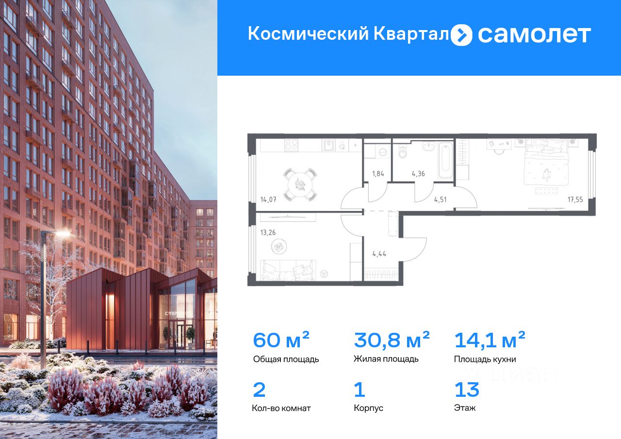 Строим кварталы для жизни с заботой о будущем. Предлагается 2-комнатная квартира комфорт-класса 60,03 кв.м в корпусе 1 на 13 этаже, в ЖК ''Космический Квартал'' Квартира с чистовой отделкой. Доступность дополнительных опций уточняйте у застройщика.