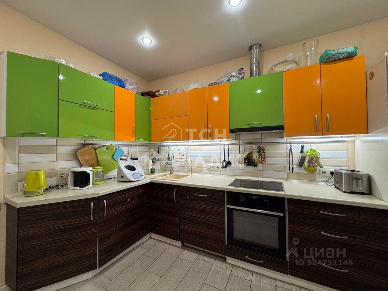 В квартире был выполненен евроремонт с использованием дорогостоящих материалов. Новым собственникам остаётся кухня со встроенной техникой: варочная панель Воsh, духовка, вытяжка, большой холодильник LG и стиральная машина Аristоn. В прихожей, коридоре и спальне размещены встроенные шкафы, выполненные на заказ под размеры помещений. Ванная комната и туалет отделаны плиткой в едином ярко-оранжевом стиле, оборудованы гарнитуром и просторной ванной 1,7м. В туалете размещен бойлер на 80л, что удобно в плановых отключениях горячей воды летом. Лоджия оборудована полками под хранение крупногабаритных предметов. Вся встроенная мебель остается покупателю.