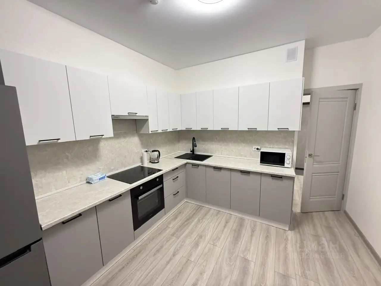 Кухня: большой кухонный гарнитур, с техникой: посудомоечная машина, духовка, холодильник, варочная панель, микроволновая печь, чайник.