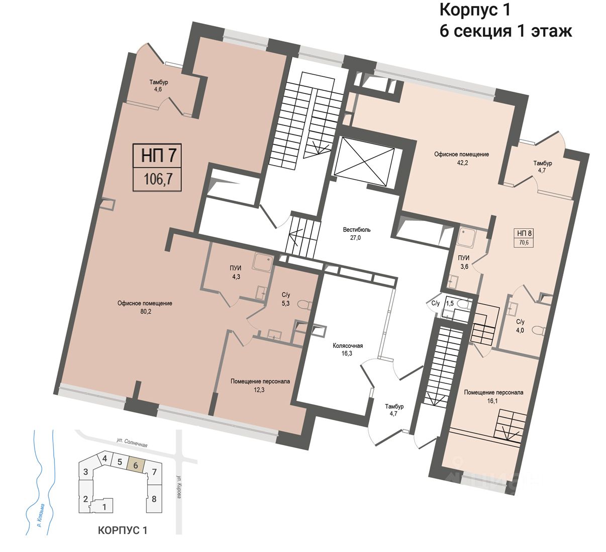 ХАРАКТЕРИСТИКИ ПОМЕЩЕНИЯ Общая площадь 106,7 кв.м. Помещение без отделки. Вход со стороны ул.Солнечная. Высота потолков 5,92 м Электрическая мощность 21,3 кВт Центральные коммуникации, современных инженерные системы.